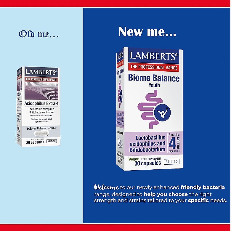 To Biome Balance Youth της Lamberts® αποτελεί ένα σκεύασμα φιλικών βακτηρίων χωρίς προσθήκη γάλακτος, που περιέχει 4 δισεκατομμύρια βακτήρια ανά κάψουλα (κατά τη στιγμή της παρασκευής).