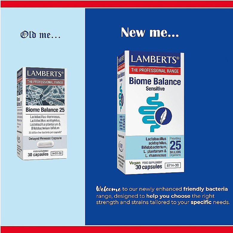 Το Biome Balance Sensitive αποτελεί σκεύασμα φιλικών βακτηρίων χωρίς προσθήκη γάλατος, που παρέχει εγγυημένα 25 δισεκατομμύρια βακτήρια ανά κάψουλα (την στιγμή της παρασκευής). Το γεγονός αυτό καθιστά το Biome Balance Sensitive ως το υψηλότερης περιεκτικότητας σκεύασμα φιλικών βακτηρίων της Lamberts®.