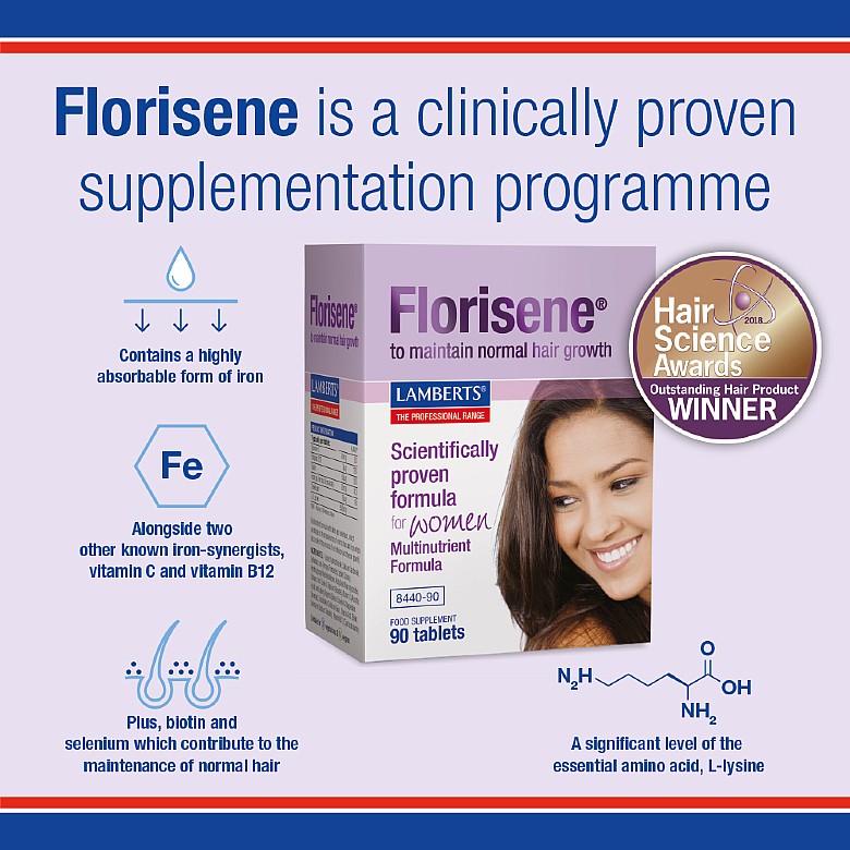 2. Τη διατήρηση της φυσιολογικής ανάπτυξης και της ομοιοστασίας της τρίχας. Η φυσιολογική ανάπτυξη της τρίχας προϋποθέτει τον φυσιολογικό πολλαπλασιασμό των κυττάρων του τριχοθυλακίου και για τον λόγο αυτό προστέθηκε στο Florisene® βιταμίνη Β12 που συμβάλλει στη διαδικασία της κυτταρικής διαίρεσης *, ενώ για τη διατήρηση της φυσιολογικής ομοιοστασίας της τρίχας προστέθηκαν βιοτίνη και σελήνιο, που συμβάλλουν στη διατήρηση της φυσιολογικής κατάστασης των μαλλιών*.