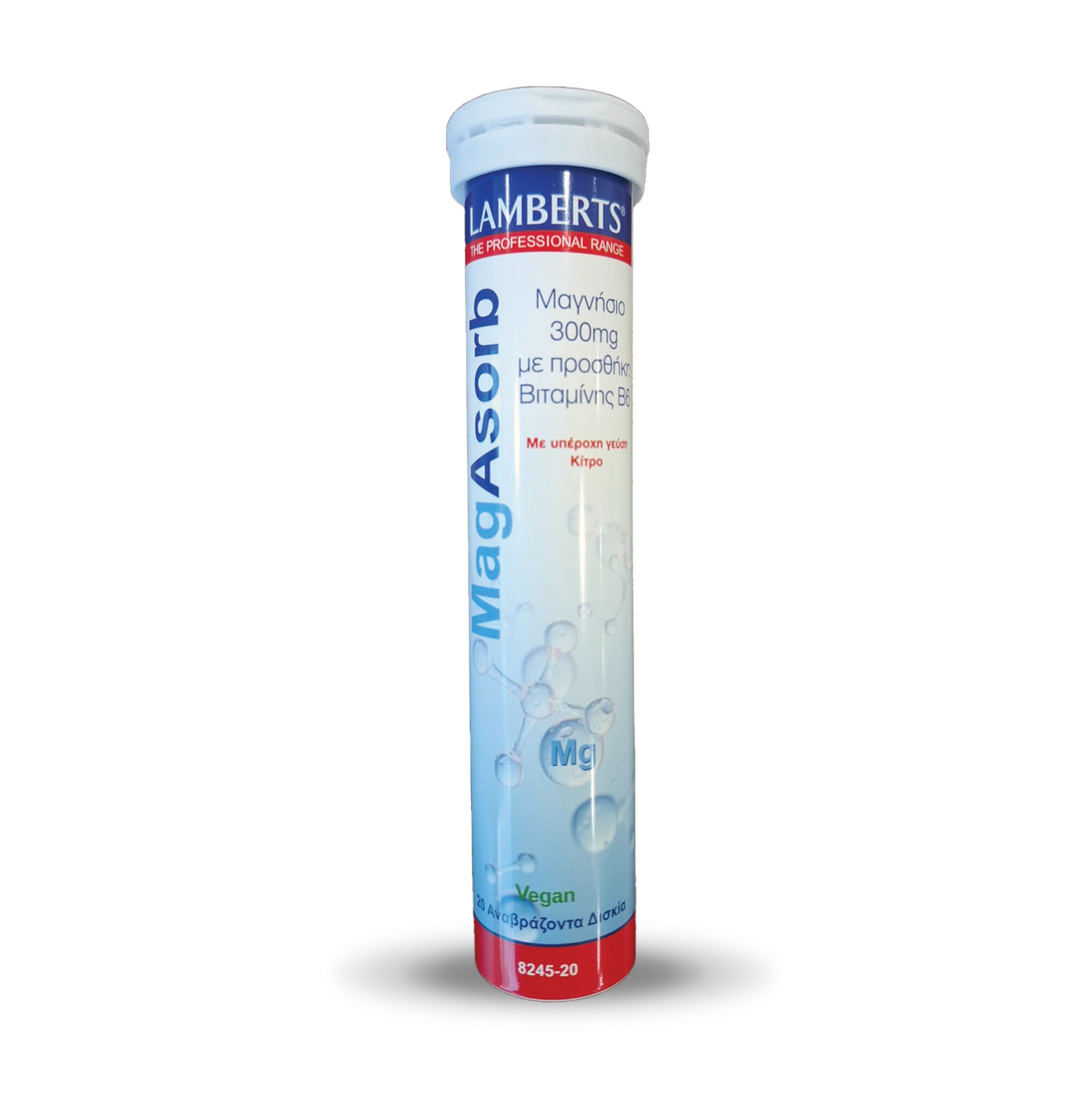 Το αναβράζον MagAsorb της Lamberts παρέχει εγγυημένα 300mg υψηλής βιοδιαθεσιμότητας μαγνήσιο με προσθήκη Βιταμίνης Β6 (4,2mg ανά ταμπλέτα)
